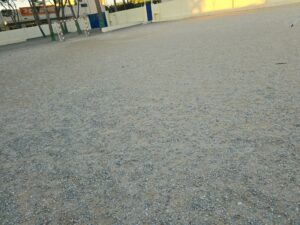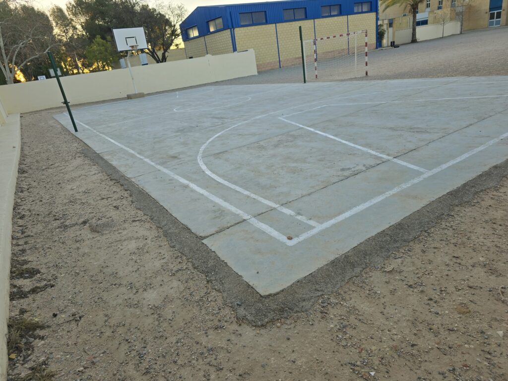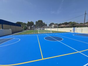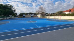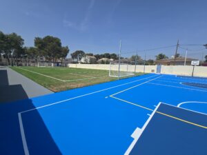 Para las pistas polideportivas se ha empleado el sistema de resinas Global Grass Sportplus, instalado sobre asfalto en 4 capas y acabado en dos tonos de azul con marcaje de líneas, garantizando resistencia, durabilidad y un excelente rendimiento deportivo.