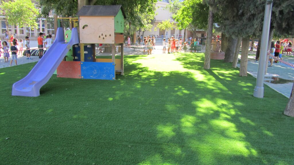 Areas que estaban totalmente olvidadas en los Colegios han sido adaptadas y aprovechadas con los césped decorativos de la línea de Global Grass. Con un grado de recuperación muy alto, sin mantenimiento y con un gran confort para que los niños de todas las edades puedan jugar, y corretear sin riesgo alguno ante caídas y golpes.