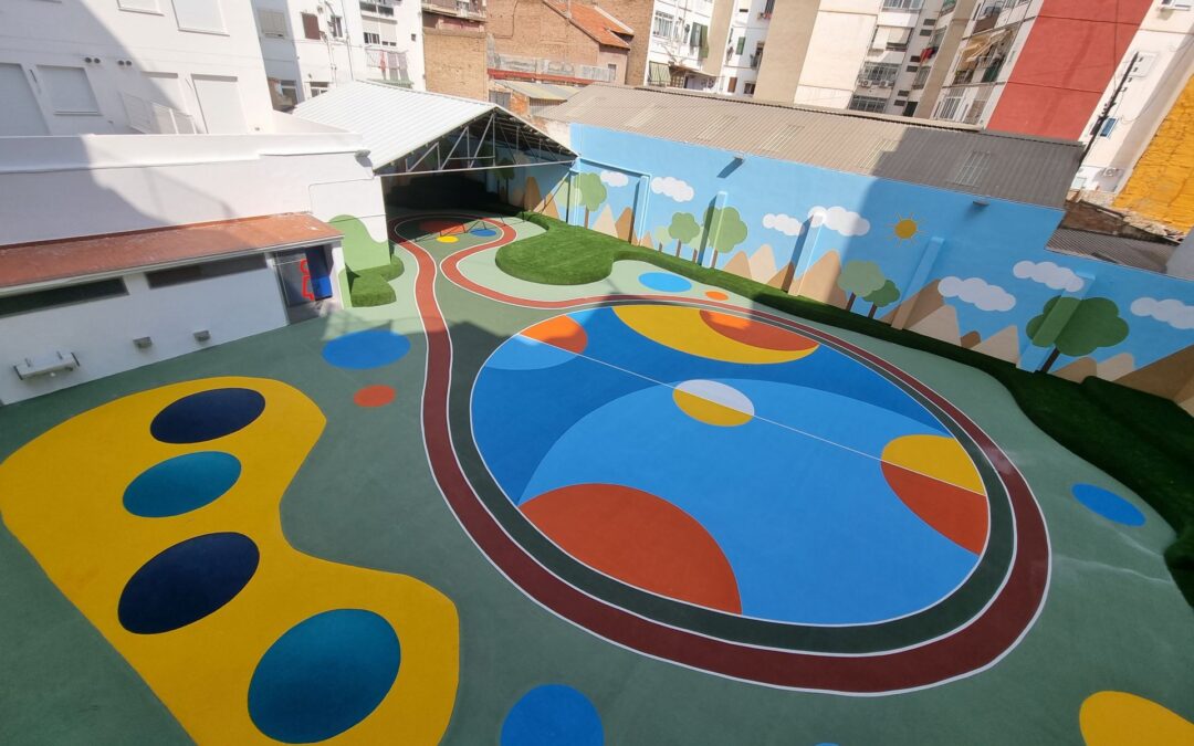 Patio diferenciado en diferentes zonas, una principal de patio de recreo, y polideportiva, otra área con juegos infantiles, otra con césped artificial a modo de gradas, caucho y resinas para el esparcimiento de los más pequeños y pintado de paredes con murales muy atractivos para el consiguiente cambio de este coqueto Colegio.