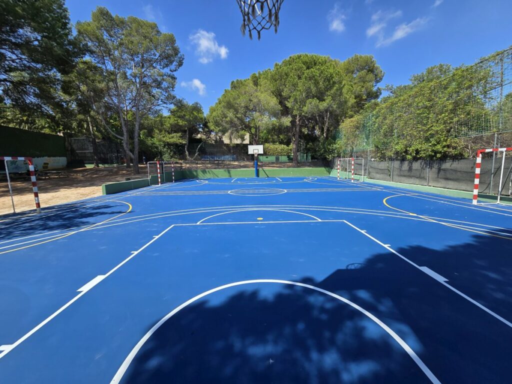 La superficie total ejecutada asciende a un total de unos 1.800 m2 con el Sistema Global Grass Sportplus sobre Hormigón para las pistas deportivas y posterior marcaje con los trabajos previos de diamantado exhaustivo, limpieza, apertura de juntas y sellado de fisuras.