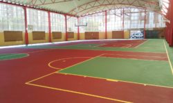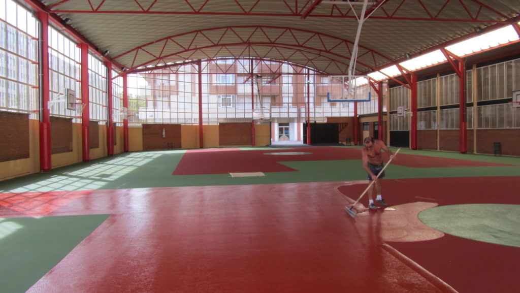 Global Grass rehabilitó una pista deportiva antigua sobre asfalto existente en 2 tonos de verde y rojo sus marcajes así como como una zona perimetral en verde entre pistas.