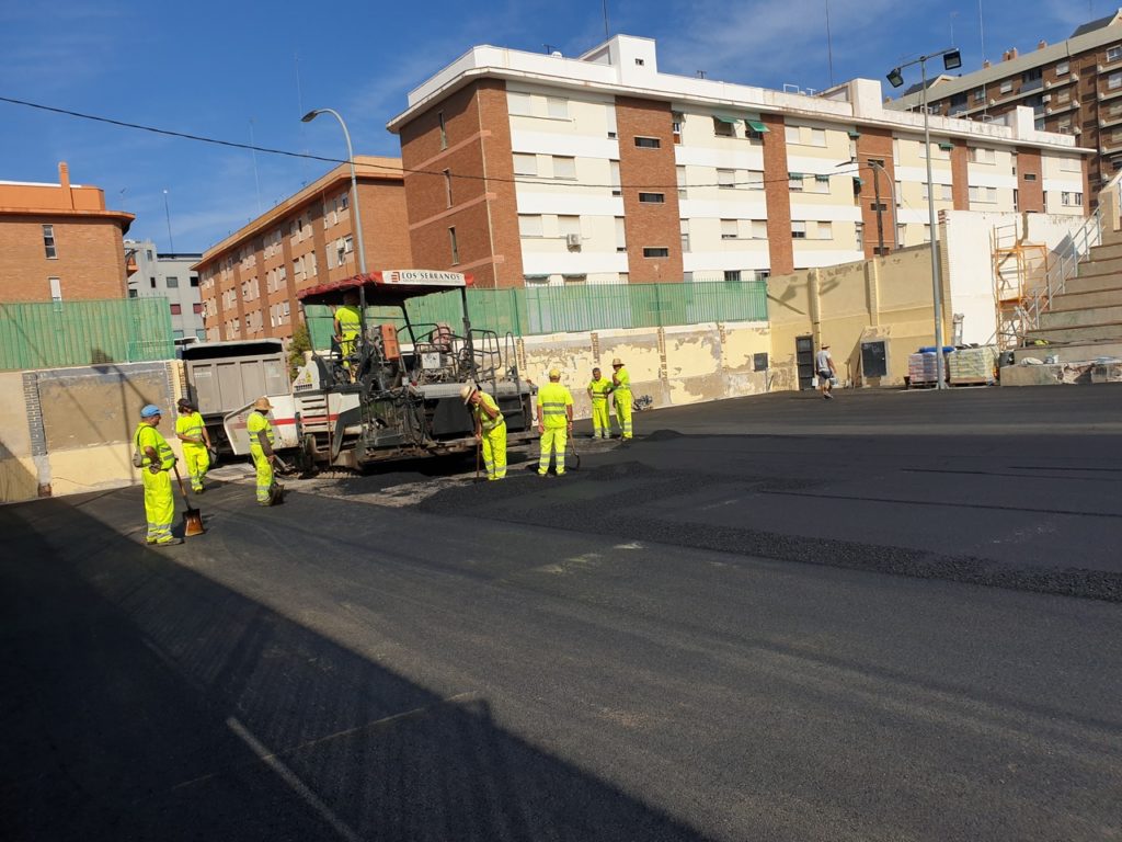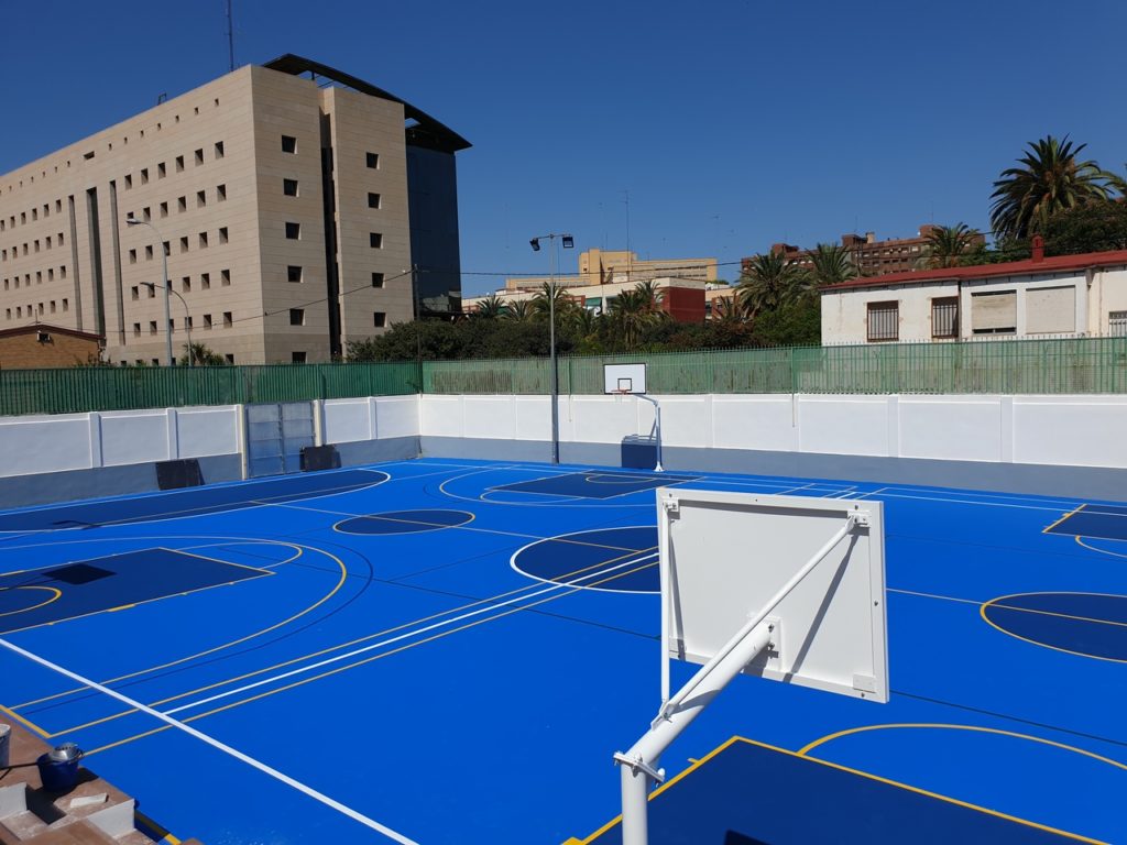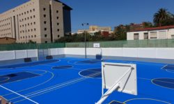 Global Grass también realizó los trabajos de previos de aglomerado pavimentando todo el patio del colegio con una aglomerado tipo D-8 generando las pendientes para posteriormente aplicar el revestimiento Sportplus en las diferentes pistas polideportivas en dos tonos de azul, y marcajes de líneas, así como instaló el equipamiento deportivo (canastas y porterias).