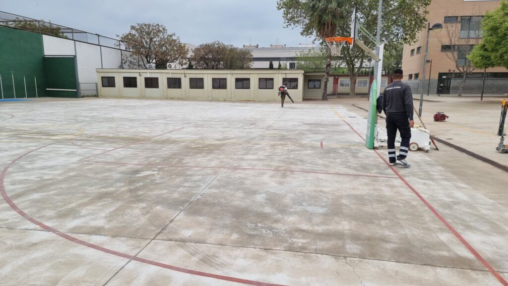 En el CEIP Principe de España se ejecutaba al mismo tiempo el revestimiento de una antigua pista polideportiva de hormigón, con múltiples fisuras que después de ser tratada se le aplicó el Sistema Global Grass con epoxis y acrílicos para que no deslizara a los alumnos del Colegio además de permitir al equipo de patinaje celebrar sus entrenamientos en la pista.