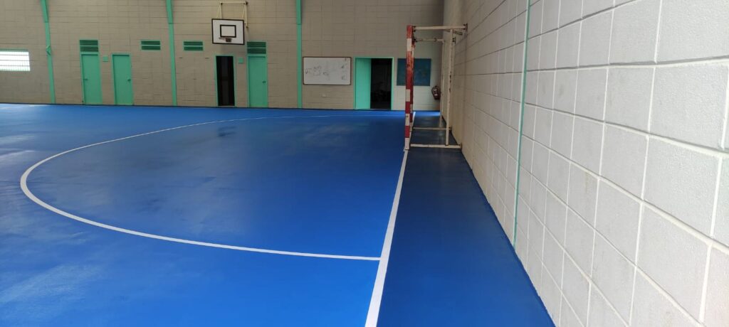 En primer lugar la obra del Colegio el Drac del Vedat de Torrente donde Global Grass ejecuto el pavimento del pabellón en 2 tonos de azul, previo diamantado y limpieza exhaustiva del pavimento anterior así como el pintado integral integral de los muros, vigas y elementos metálicos del pabellón ganando en luminosidad y acorde los colores corporativos del Colegio.