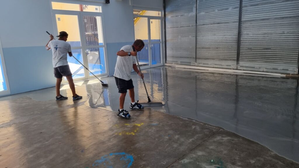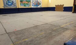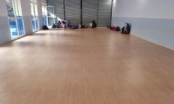 Los trabajos del patio consistieron en el extendido del hormigón sobre la antigua losa para posteriormente aplicar el Sistema de resinas Global Grass Sportplus sobre hormigón. En el gimnasio después de un saneado previo del soporte dañado se recreció con mortero autonivelante de toda la sala para la posterior colocación del pavimento Global Grass Graboflex en 4 mm en símil madera, con el rodapié de remate en color blanco.