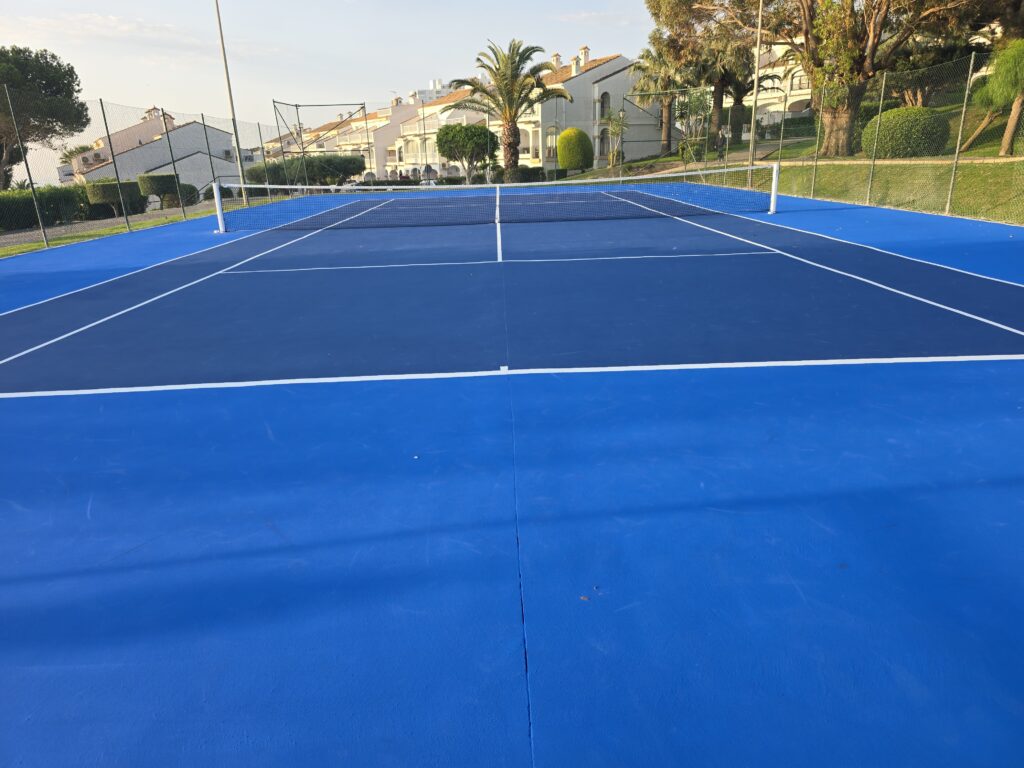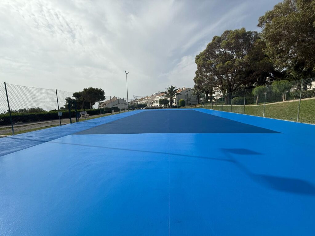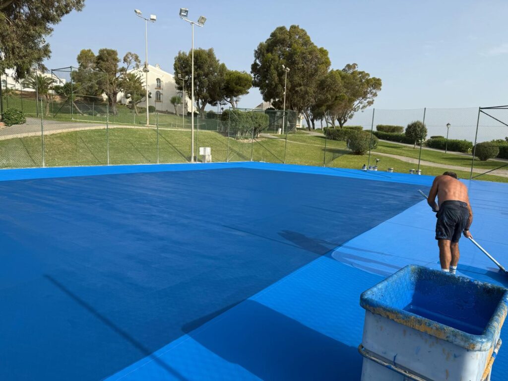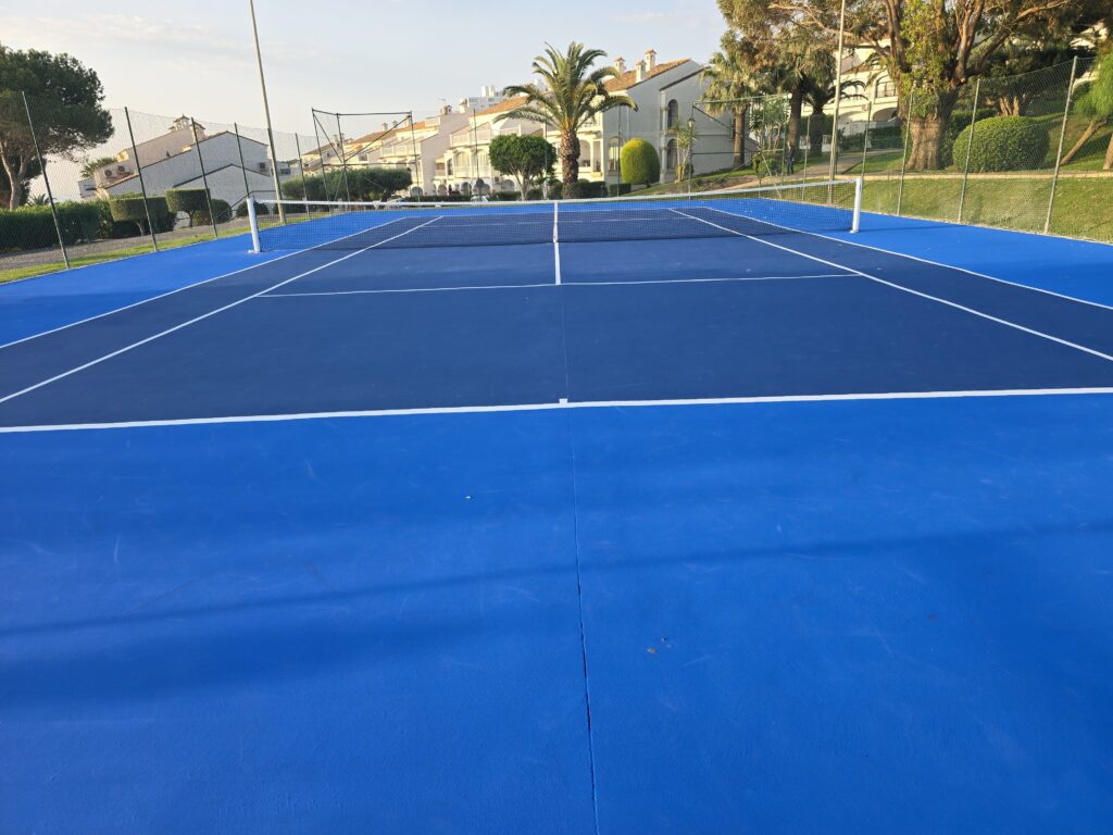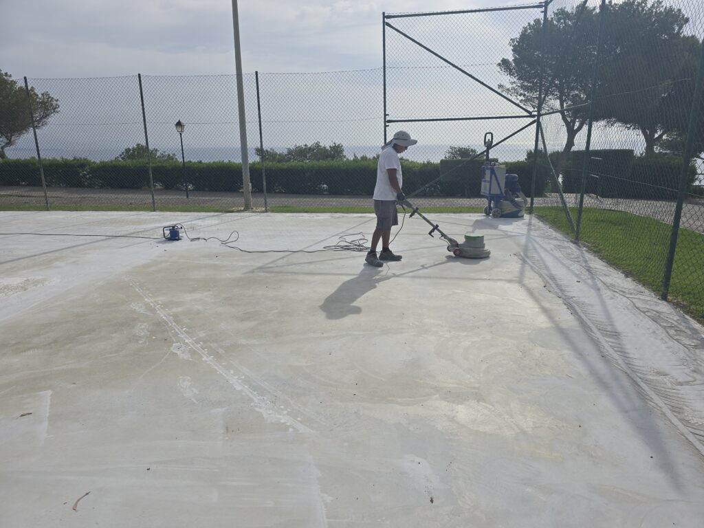 Después de un exigente replanteo se procedió al bombeo de hormigón a más de 60 m de distancia para extender la losa de hormigón con sus respectivas pendientes. Para después del consiguiente curado , se realizó un diamantado previo y limpieza con agua a presión de la pista para posteriormente aplicar el Sistema de resinas Global Grass Tenislife de 4 capas sobre hormigón en 2 tonos de azul en contraste con las vistas al mar Mediterráneo tan cercano.
