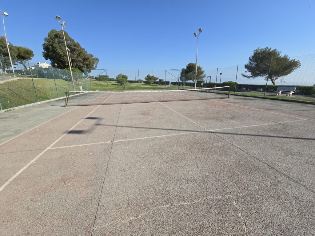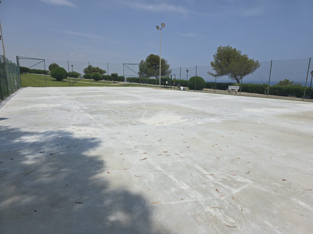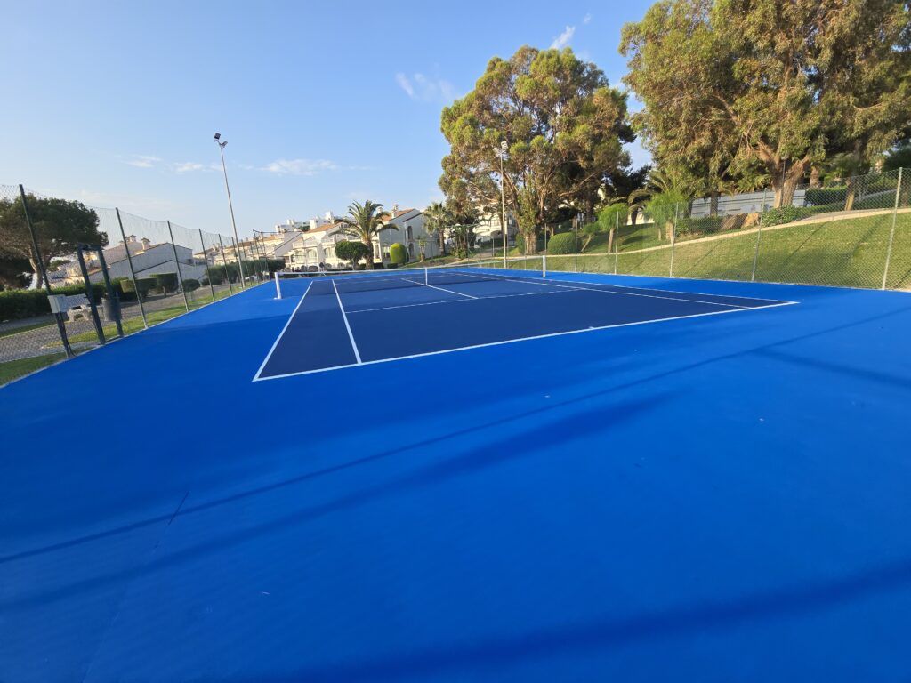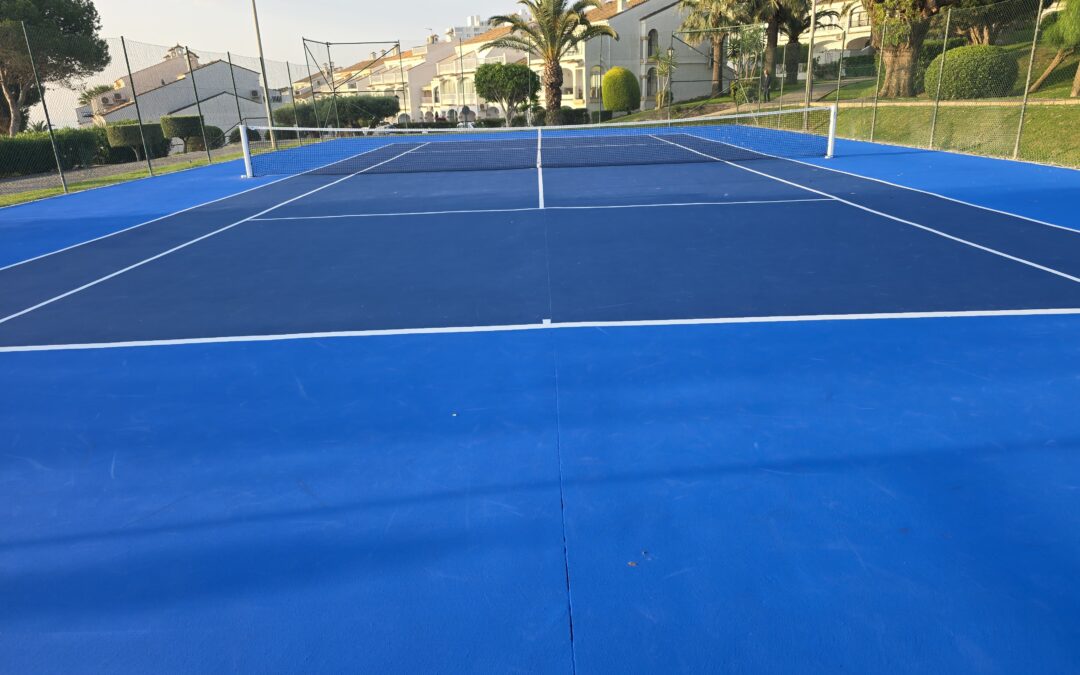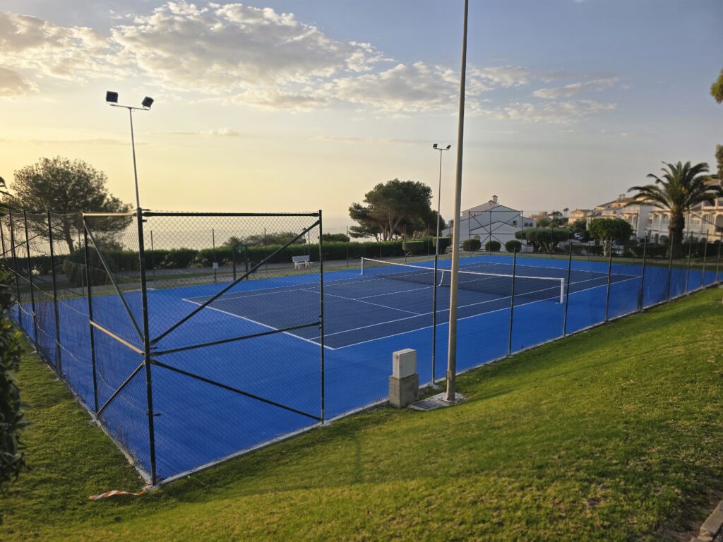 Después de un exigente replanteo se procedió al bombeo de hormigón a más de 60 m de distancia para extender la losa de hormigón con sus respectivas pendientes. Para después del consiguiente curado , se realizó un diamantado previo y limpieza con agua a presión de la pista para posteriormente aplicar el Sistema de resinas Global Grass Tenislife de 4 capas sobre hormigón en 2 tonos de azul en contraste con las vistas al mar Mediterráneo tan cercano.