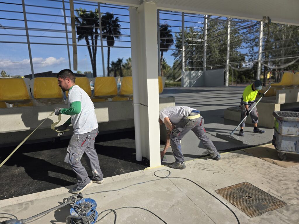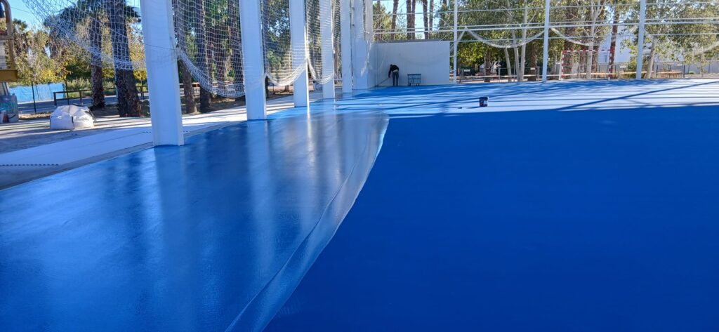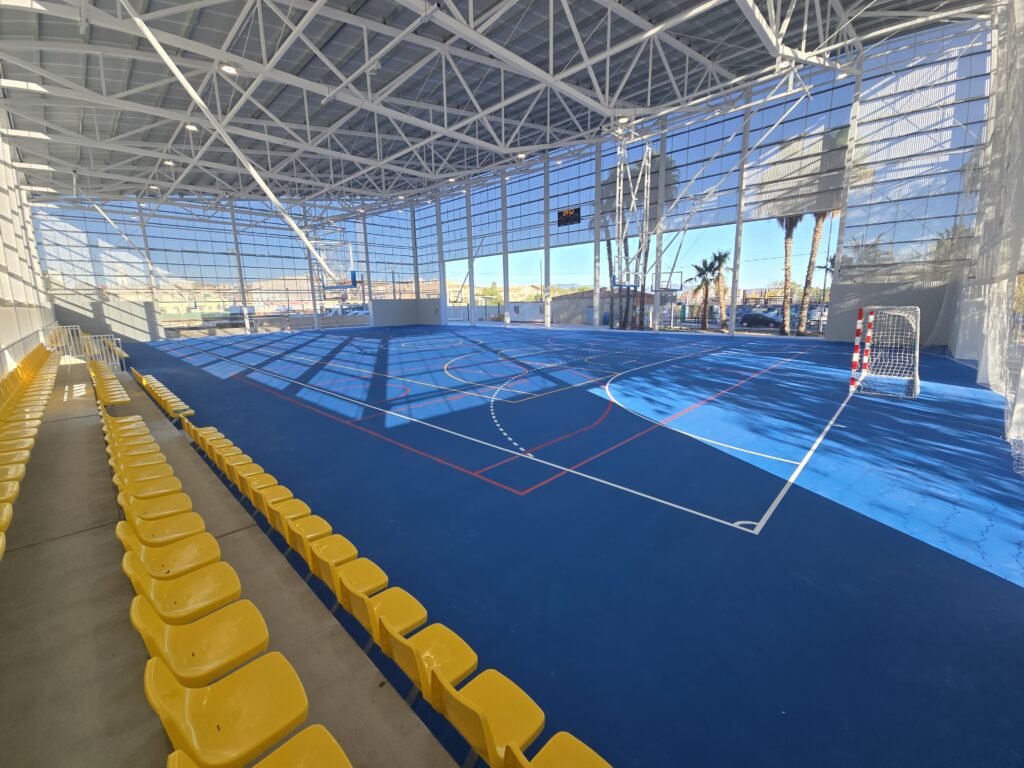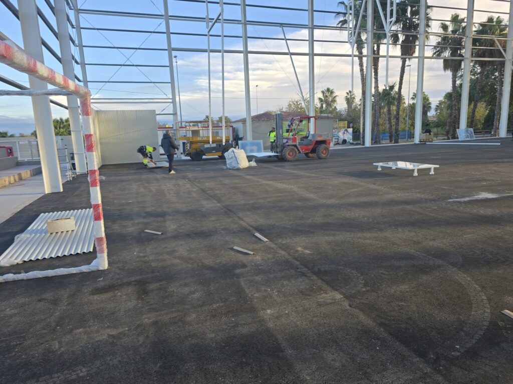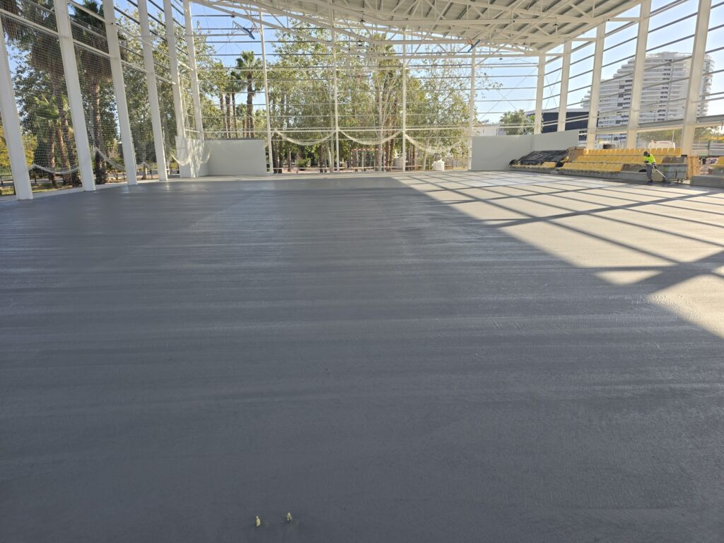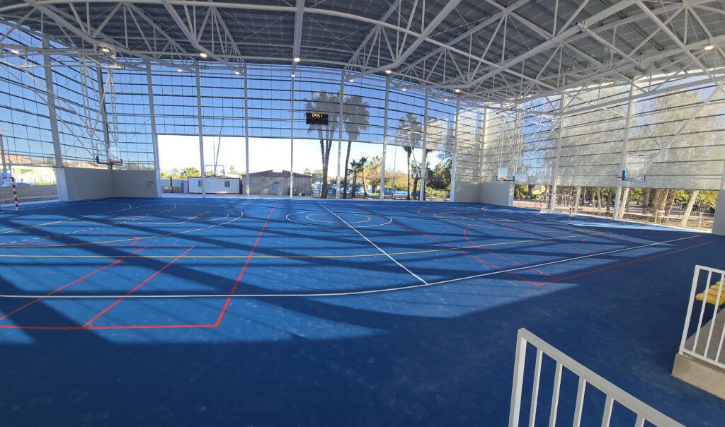 La instalación cuenta con una moderna y espectacular cubierta blanca de nueva creación, abierta en los laterales y apoyada sobre una base de asfalto. Sobre esta superficie se ha aplicado el Sistema Global Grass Sportplus, un pavimento de resinas polivalente, idóneo para pabellones cubiertos, semicubiertos y exteriores.