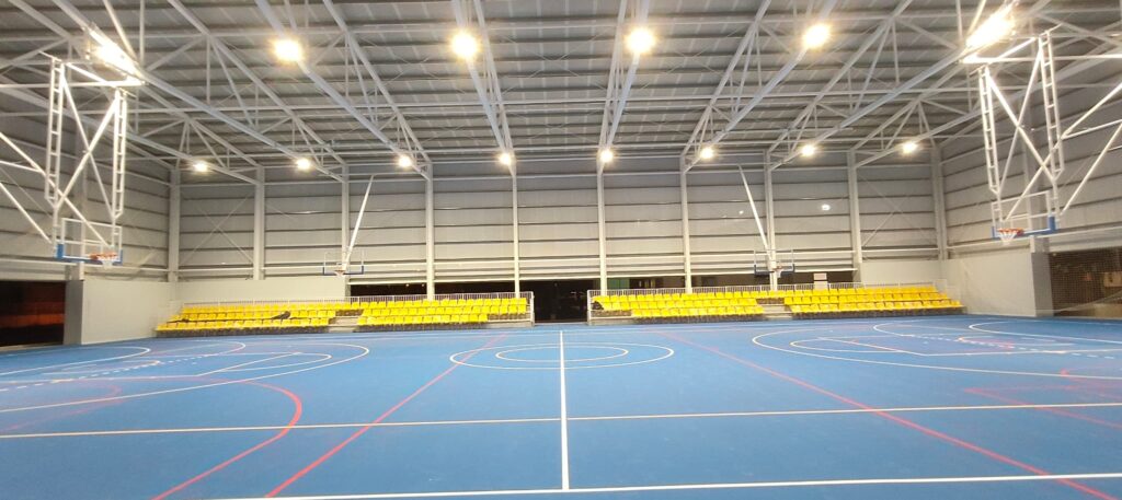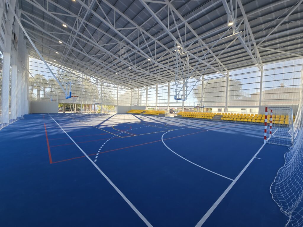 En total, se han ejecutado 1.600 m² de superficie deportiva en color azul, incluyendo cuatro marcaciones de pistas. Además, Global Grass ha llevado a cabo la instalación completa del equipamiento deportivo, entre ellos porterías, canastas eléctricas, redes de protección y los vistosos asientos de las gradas.